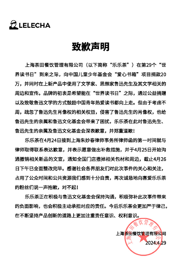 乐乐茶发布声明,就“侵害鲁迅先生肖像权”一事对鲁迅先生及相关亲属、鲁迅文化基金会致歉.