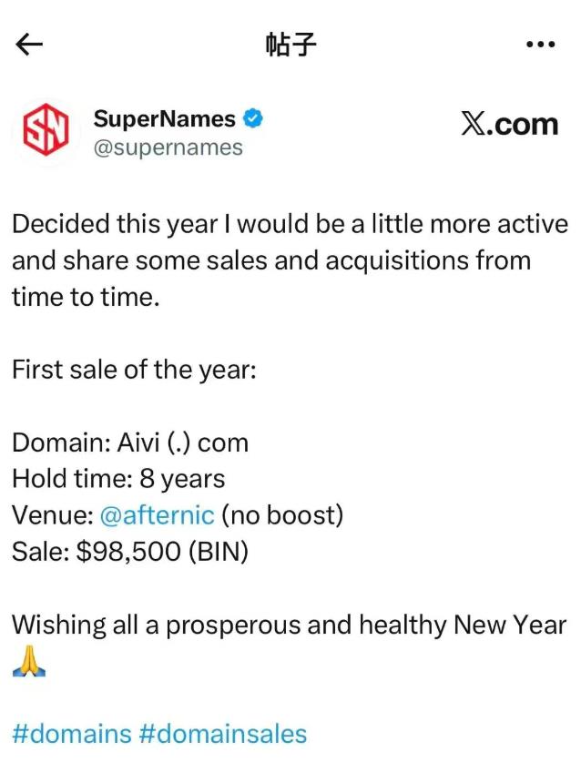 近日,一枚持有八年的短域名Aivi.com在域名交易平台Afternic上以98,500美元(约合人民币71万元)的价格成功售出,成为近期域名投资市场中又一笔引人注目的交易。