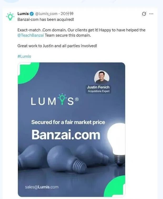 近日,Lumis公司宣布成功为TeachBanzai团队收购了Banzai.com域名。这一消息由Lumis官方在社交媒体上发布,引发业内关注。作为一枚“完美匹配”的.com域名,Banzai.com不仅与品牌名称高度一致,更在品牌识别、用户信任度和市场拓展方面具备显著优势。