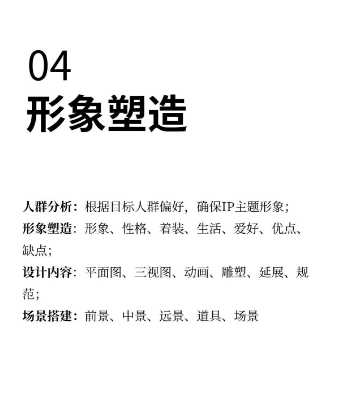 4. 形象塑造:分析目标人群偏好,以确定IP主题形象;塑造形象涵盖性格、着装、生活等多方面;设计内容包括平面图、动画等;进行前景、道具等场景搭建。