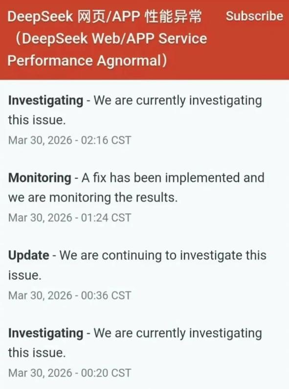 3月29日晚间,国内主流大模型平台DeepSeek遭遇大范围服务故障,网页端与移动端App频繁弹出“服务器繁忙,请稍后再试”提示,深度思考、长文本推理、代码生成等核心功能大面积限流甚至无法使用,目前仍未恢复。相关话题迅速冲上微博热搜,引发全网热议。