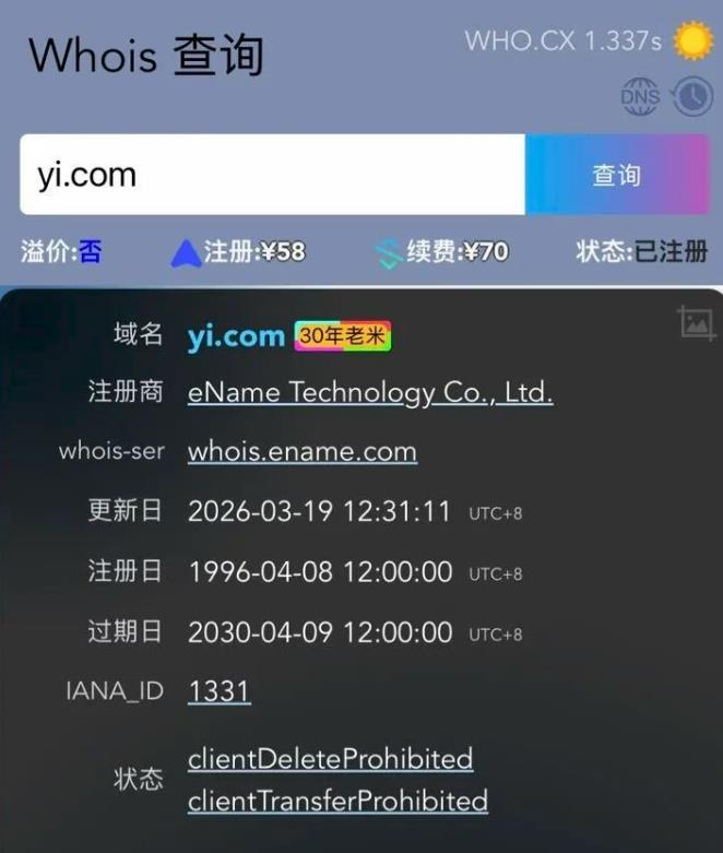 这枚域名注册于1996年,至今已有近 30 年历史,是真正的 “古董级” 精品域名。