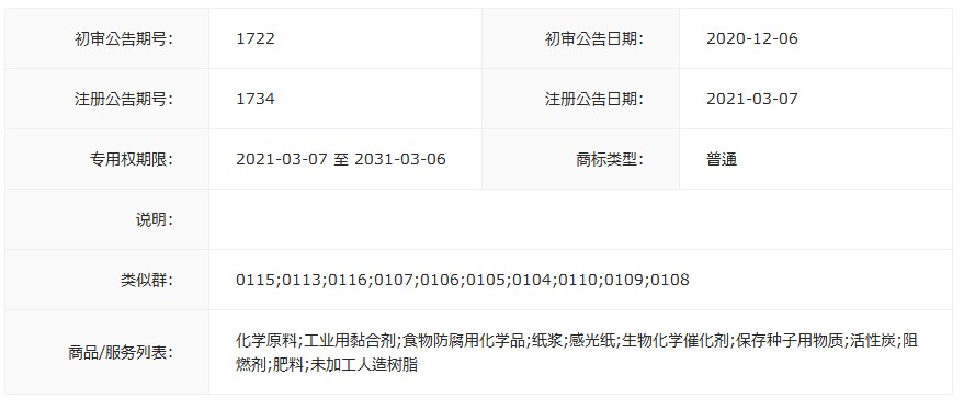 商品服务:化学原料;工业用黏合剂;食物防腐用化学品;纸浆;感光纸;生物化学催化剂;保存种子用物质;活性炭;阻燃剂;肥料;未加工人造树脂